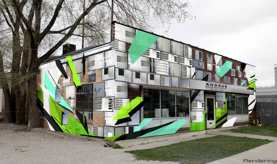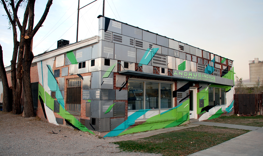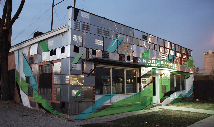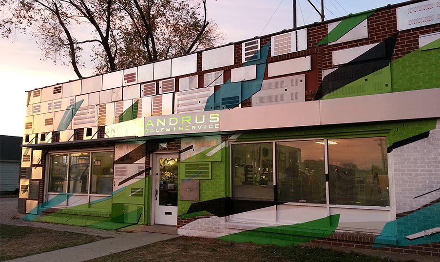 Andrus Sales and Service buys and sells used and new restaurant equipment. What started as a hypothetical facade renovation turned into an eight month project soon after meeting with the owner. After seeing how many hundreds of machines get thrown out of his stockpile every year, the concept centered on having the recycled panels be part of the facade. The stainless steel panels became the cladding over the existing brick veneer. The panels are all very unique but are organized in a way to tell a cohesive story. Graffiti is widely found and accepted in this neighborhood, and was used as a mural to integrate the panels. The three main components each represent an integral factor in the business’ success: the brick reminds visitors of the building’s history; the metal panels, the business itself; and the graffiti, the personality of the surrounding neighborhood.