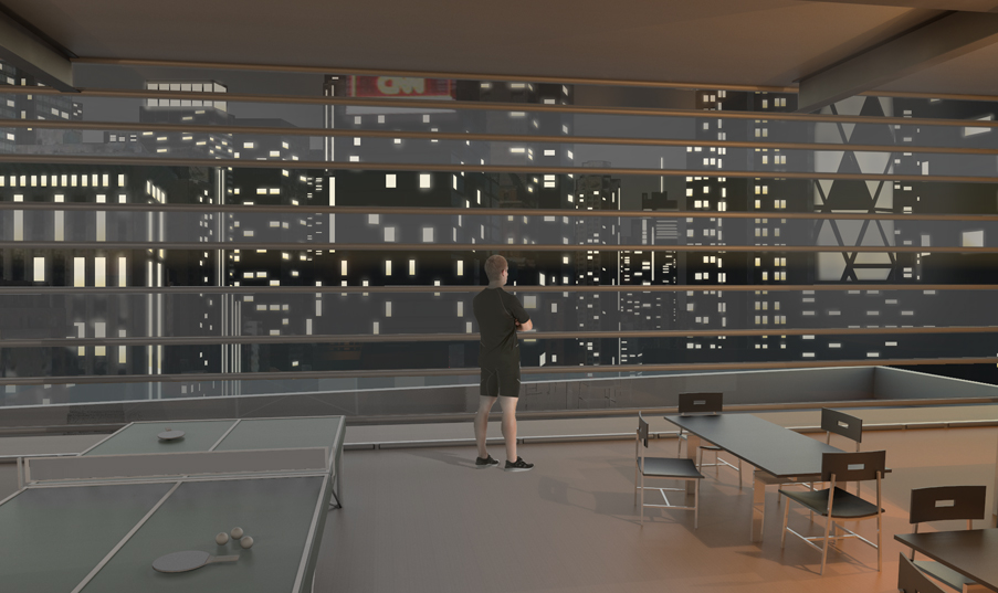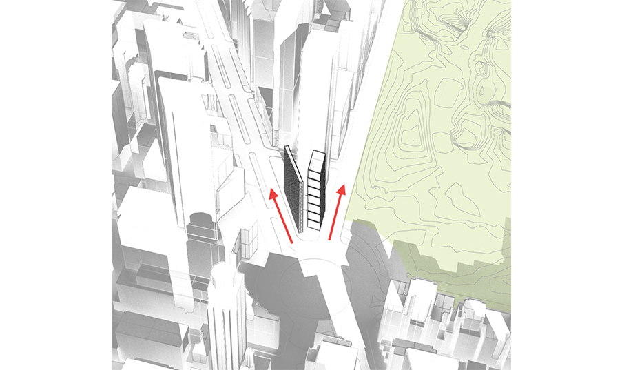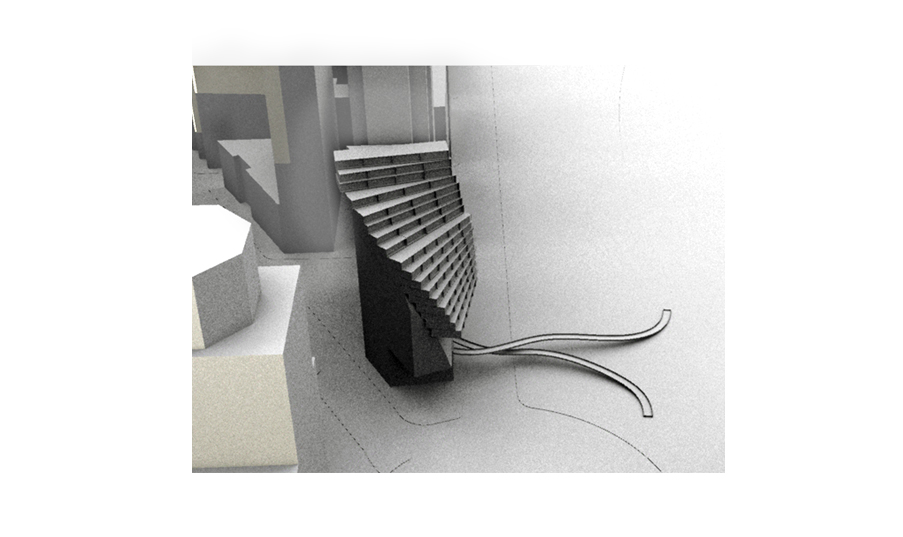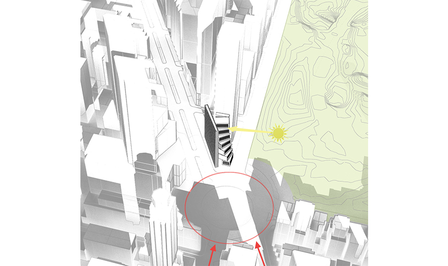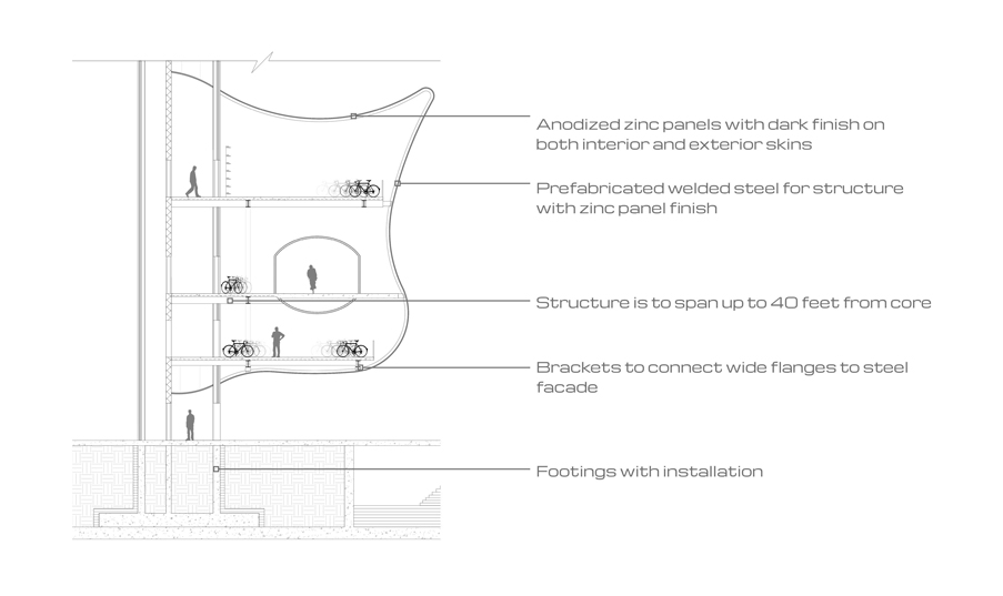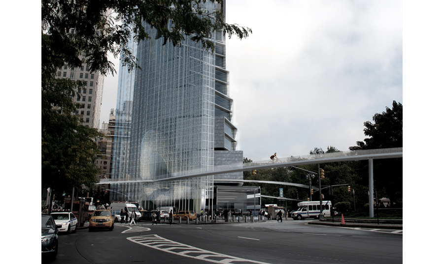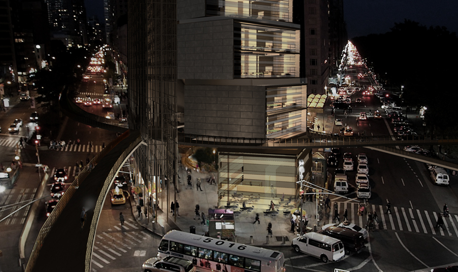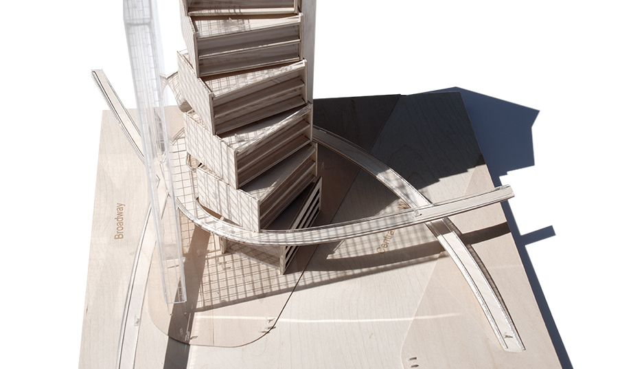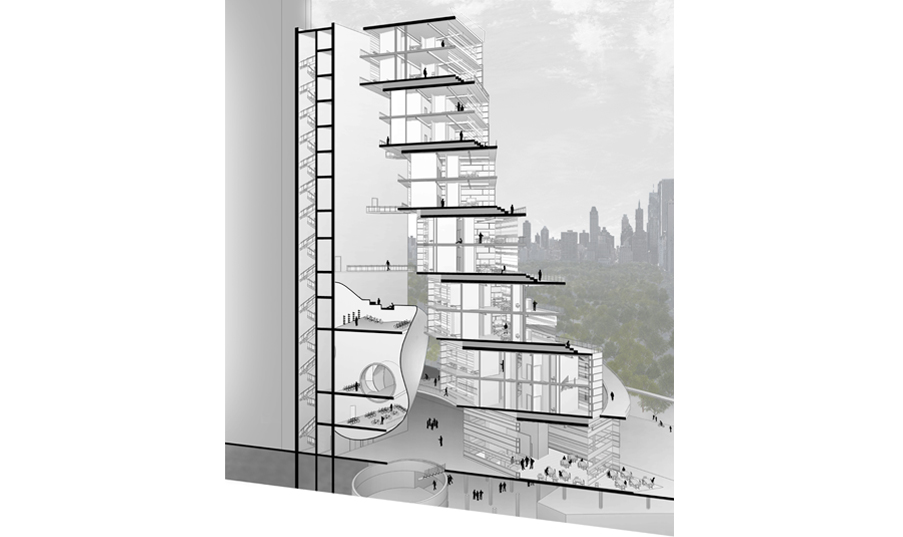 The building’s design has (3) components to it: athletic housing units, a bike shop with branching bike ramps to the park, and a bike depository. The cafe on the ground floor addresses Central Park west and Columbus Circle with outdoor seating. The rectangular form is a modular expression of the program inside. The temporary housing above keeps the same language as the cafe but uses different treatments of glass to reflect private versus public space. As it twists to address Columbus Circle, 8th Ave and Broadway, the building gains solar exposure as it reaches 200’ and attaches to a core that orientates with Trump Tower. The ramps act as a literal connection to the park from the athletic hub. As the paths move from the organic nature of the park into the building, the vitality of the park was reflected in the organic form that acts as the heart of the complex and houses the bike and athletic shop. The bike depository is very linear and stands tall to address Broadway. It is a long linear space that uses an automated retrieval system to collect a patrons bike quickly. The stored bicycles create an interactive facade as they get moved around. The hierarchy of the three elements creates a space that won’t be forgotten by athletes and residents alike.